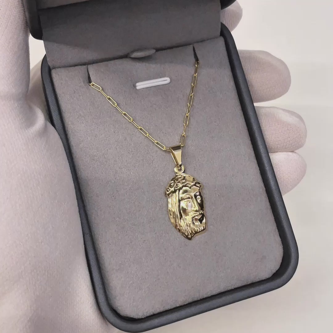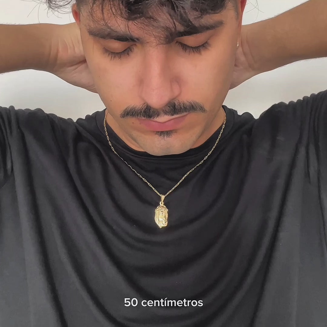 Corrente masculina cartier com pingente Jesus. Seu design exclusivo apresenta uma face de Cristo em detalhes delicados, enquanto seu banho de ouro 18k garante um brilho duradouro. Um acessório luxuoso que enriquece qualquer look.