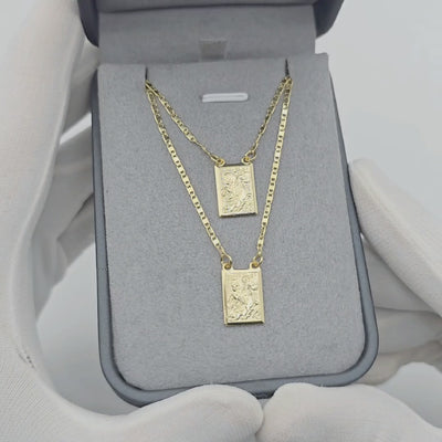 Este escapulário São Jorge, banhado a ouro 18k, combina proteção e elegância em uma peça sofisticada. Seu acabamento refinado realça detalhes delicados, tornando-o ideal para quem busca um acessório que une fé e estilo com requinte. Perfeito para uso diário ou ocasiões especiais, oferece um toque de distinção e significado ao seu visual.